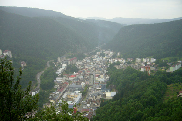 Blick vom Rocher au Dade auf Morez im französischen Jura. Das Wetter war anfangs eher mäßig, aber auch der Dauerregen hielt mich nicht davon ab, um der (vermeintlichen) Aussicht willen auf Berge zu klettern.