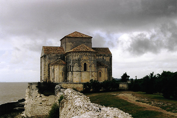 Am nördlichen Ufer der Gironde, die ab Bordeaux einen breiten Mündungstrichter bildet, liegt die Region Saintonge (am südlichen Ufer ist das Médoc, dazu später mehr). Die Küste ist zumeist felsig, teilweise recht steil, so wie hier in Talmont-sur-Gironde, wo die romanische Kirche Sainte-Radegonde nur mehr knapp neben dem Abgrund steht.