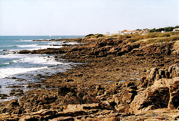 So steinig ist es nur südlich von Les Sables d'Olonne; die Stadt selbst (im Hintergrund noch zu erkennen) bietet schöne Sandstrände, wie der Name ja auch schon sagt. Der hier abgebildete Küstenabschnitt heißt Puits d'Enfer.