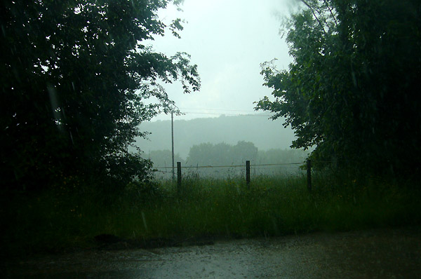 Zur Abwechslung: Regen. Das im Vordergrund ist kein Gewässer, sondern die Straße.