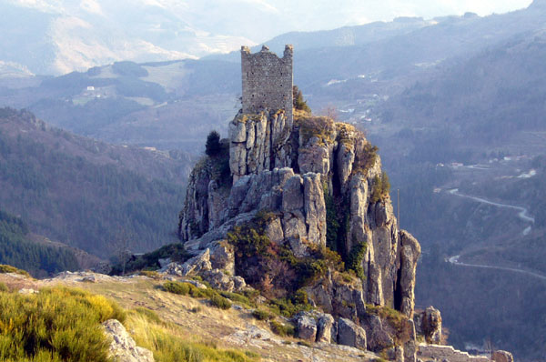 Zunächst einige Bilder von meiner Tour durch das an Ostern 2008 noch sehr winterliche Zentralmassiv und das Vivarais. Die Fahrt begann im Norden des Départements Ardèche, nordwestlich von Valence. Hier die Burgruine von Rochebonne.