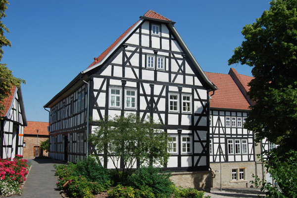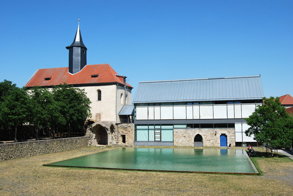 Man kann es der heutigen Anlage nicht auf den ersten Blick ansehen, aber Volkenroda in Thüringen gehört zu den bedeutendsten Zisterzienserklöstern auf deutschem Boden. Gegründet wurde das Kloster 1128 zunächst für Benediktiner, die aber schon 1131 durch Zisterzienser aus Kamp am Niederrhein ersetzt wurden. Volkenroda war reich begütert und gründete vier ebenfalls recht bedeutende Tochterklöster: Waldsassen, Reifenstein, Loccum und Doberlug. In den Bauernkriegen wurde die Klosteranlage verwüstet, und wenige Jahre später (1540) kam mit der Reformation im albertinischen Sachsen das Ende des Klosters. Die Gebäude verfielen anschließend, und die Ruinen wurden erst im 19. Jahrhundert gesichert. Auch in der DDR-Zeit gab es nahezu keine Erhaltungsmaßnahmen; die Kirche wurde noch bis 1968 als Pfarrkirche genutzt und dann als baufällig geschlossen. Seit 1994 wird das Gelände durch die Jesus-Bruderschaft Gnadenthal bewohnt; seitdem wurden einige Neubauten errichtet, zum Beispiel das neben der Klosterkirche stehende Konventsgebäude (Bild oben). Es gibt hier auch ein Tagungszentrum und ein Jugendbildungszentrum. Neben der eigentlichen Klosteranlage steht das Gut Volkenroda mit schönen Fachwerkhäusern.